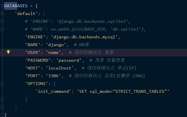"OPTIONS": {"init_command": 'SET sql_mode="STRICT_TRANS_TABLES"'},