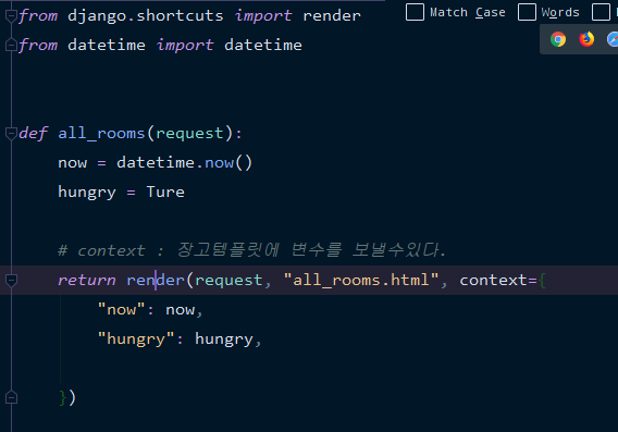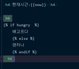 이런식으로 {% %} 를사용한다! 이경우 hungry 변수를 Ture 로 해놓았기때문에 배고프다가 출력된다 !