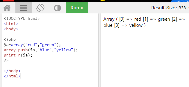 PHP array_push() Function ❮ PHP Array Reference Example Insert "blue" and "yellow" to the end of an array: Try it Yourself » Definition and Usage The array_push() function inser
