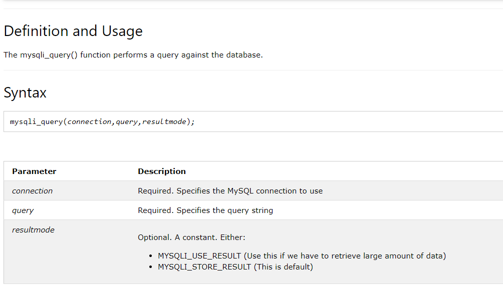 10. mysqli_query() => 출처 :https://www.w3schools.com/php/func_mysqli_query.asp